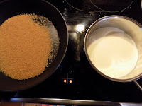 Kõigepealt kaaluda pannile suhkur ja sulatada. Kõrval pliidiaugule panen ma kastruli ja koore, et ta jõuaks soojaks minna.
