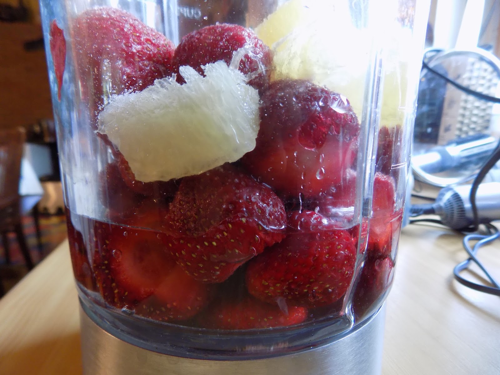 Kõigepealt siis lõikan maasikate sabad ära, panen kohe nad kannmikserisse valmis, lõikan sidruni pooleks, koorin, eemaldan seemned, lisan ka nemad kannu, supsutan peale suhkru ja lisan ka pisut kraanivett, et mikser üldse tööle saaks hakata. Lasen ta täiesti peeneks.