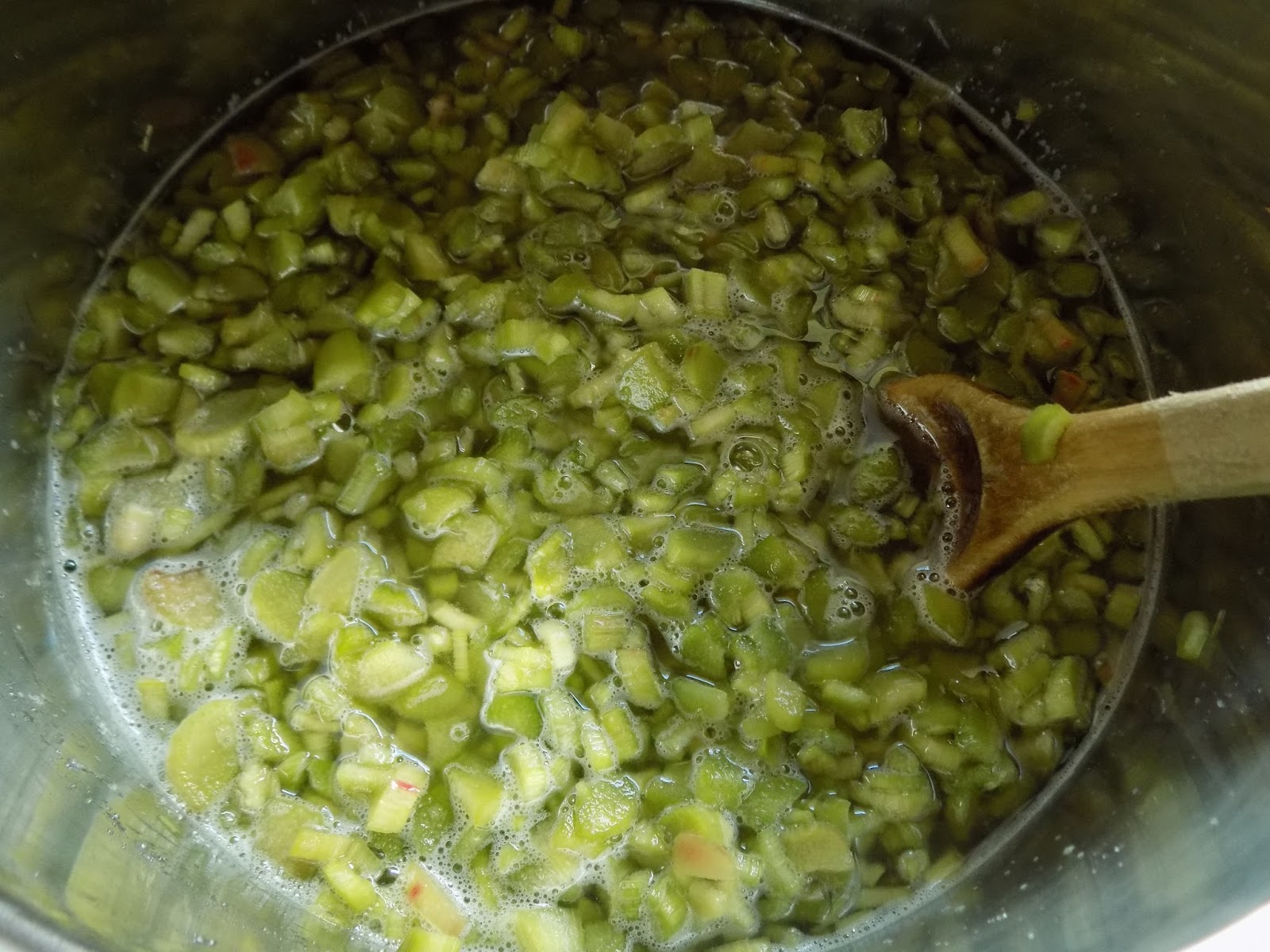 Kõigepealt siis tuleks ära koorida rabarberivarred ja lõikuda nad suhteliselt õhukeseks. Siis kaaluda peale õige suhkrukogus ja jätta seisma, kas üleööks või niikauaks et rabarberil on mahl välja tulnud (mul esimene sats seisis suhkruga 10 tundi, teine sats 12 tundi).