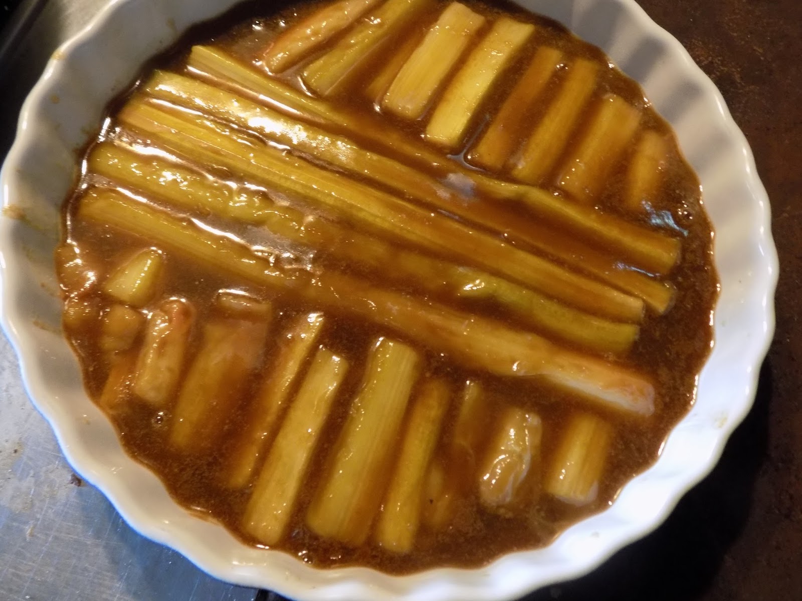 Ja nemad ma lõikasin oma 28 cm keraamilisse koogivormi parajaks, et hiljem oleks ka pisut silmailu. Kui rabarberid on meelepärase kuju ja suurusega, tuleks nad kõik madala kuumusega podisevas karamellikastmes natuke pehmemaks küpsetada, mitte päris lödiks aga nii et nad hoiaksid veel oma kuju kuid oleks juba pehmed. Võib ka ahju nüüd kuuma panna 220 kraadi juurde (kasutasin alguses grillrežiimi, hiljem keerasin kuumuse 200 peale), kes kasutavad poelehttaigent vaadaku paki pealt, aga seal vist umbes sama kraad. Ja igaüks tunneb ja teab oma ahju ja programme ise :).