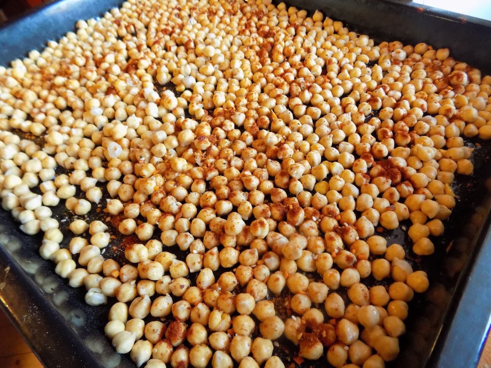 Siis kallasin ma kuivad kikerherned ahjupannile ja hakkasin maitsestama. Lisasin natuke soola, pipart, õli, paprikapulbri ja dukkah, ning segasin kõik korralikult läbi.