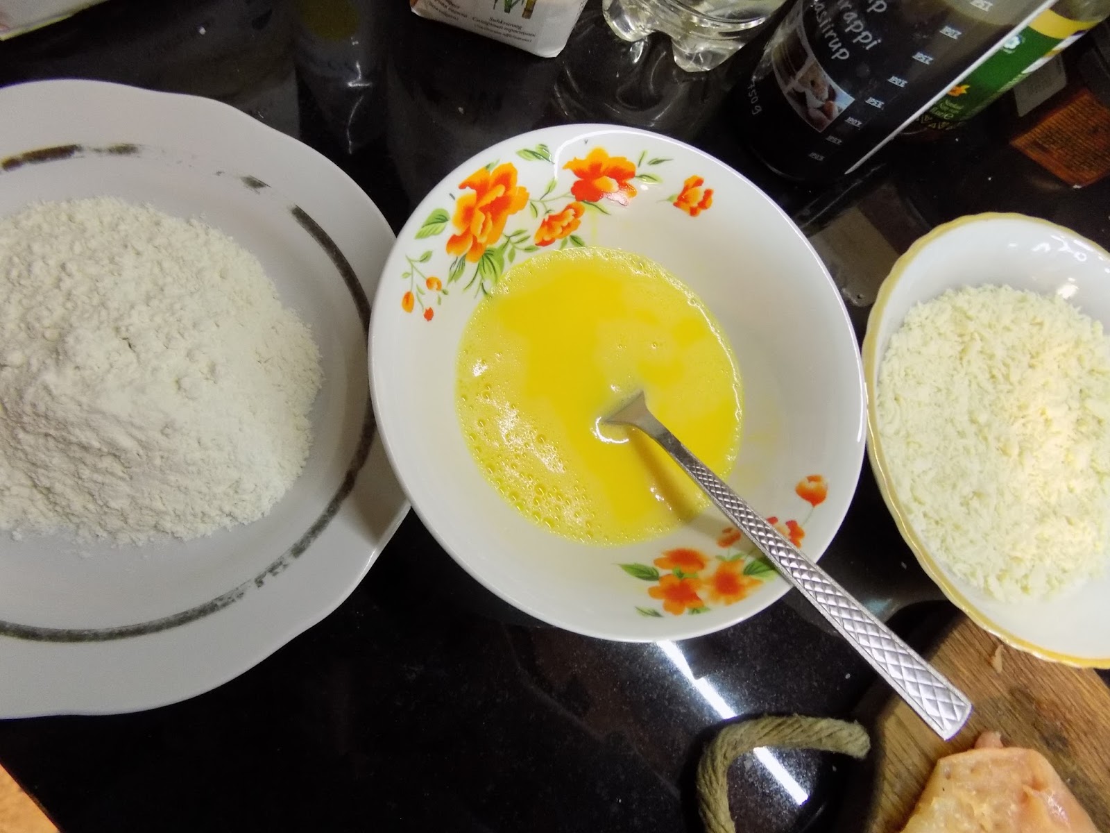 Esimesse kaussi jahu, teise klopi lahti muna ja lisa pisut vett ning nats soola;pipart, ning kolmandasse panko riivsai. Iga fileega käid kõik kolm kaussi läbi (kõigepealt jahus, siis munas ja viimasena riivsaias) ja ongi valmis. Nagu ma ennist kirjutasin, siis ma teen tavaliselt nad pool päeva ette valmis ja mulle tundub et siis jääb see paneering nagu paremini külge ka, aga see võib olla ka mu luulu :).