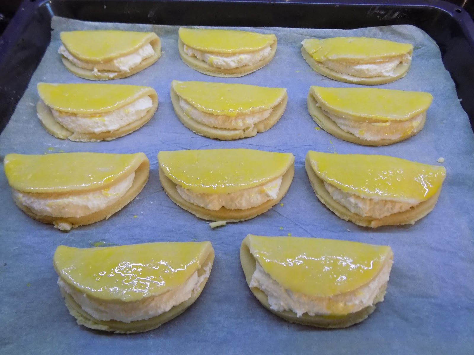 Tööpind jahuga kokku, ning vaikselt taignarulliga rullid ta laiali, mina mingeid millimeetreid ei jälgi aga öeldakse, et umbes 3-4 mm ta peaks olema. Siis tuleks lõigata millegi ümmargusega välja ringid, panna sisu 1 kuhjaga spl ja voltida poolkuuks, ning asetada küpsetuspaberiga kaetud ahjupannile. Siis kui mõni on tehtud, võib ka ahju 210 kraadi juurde kuumenema panna.