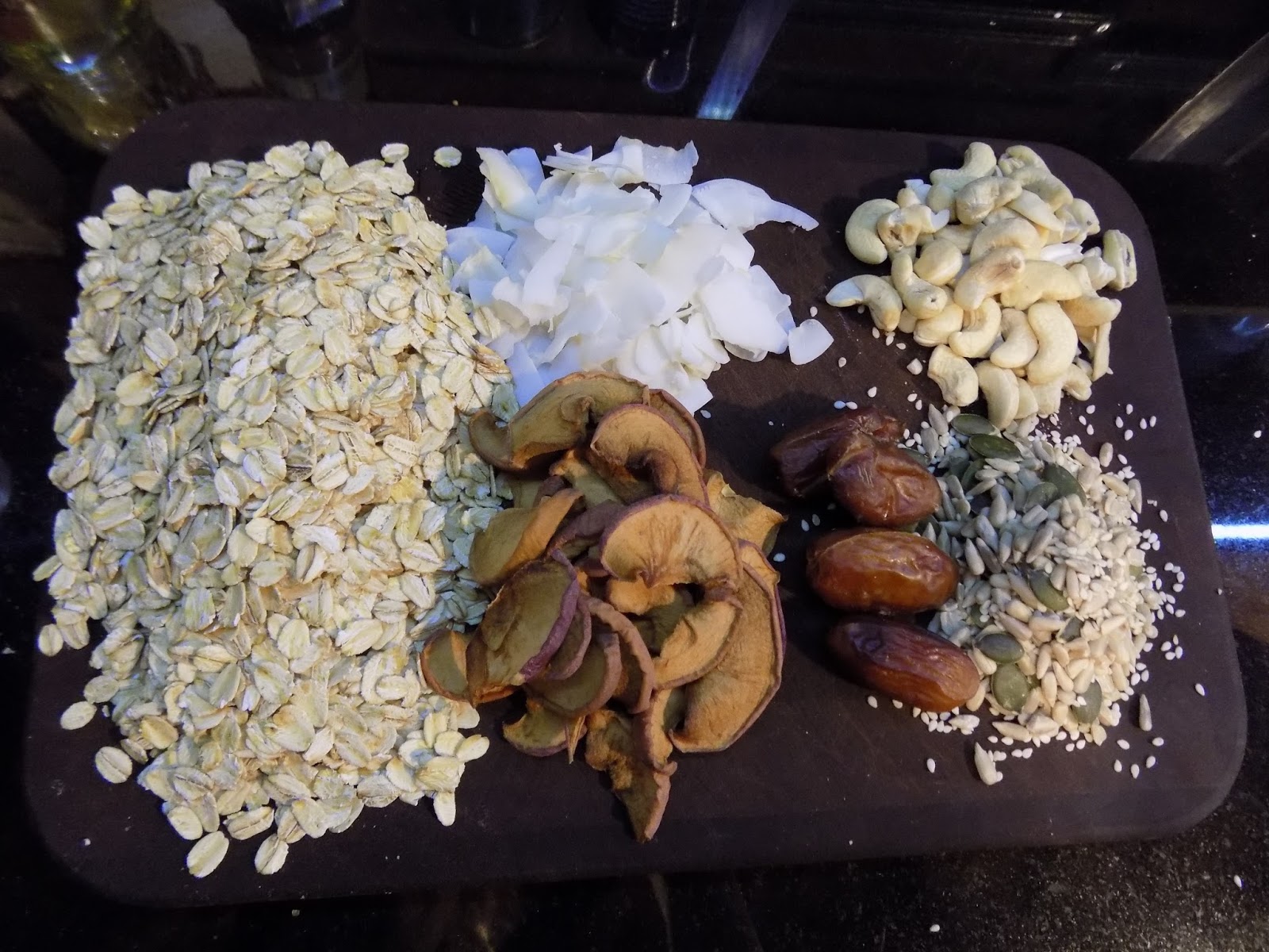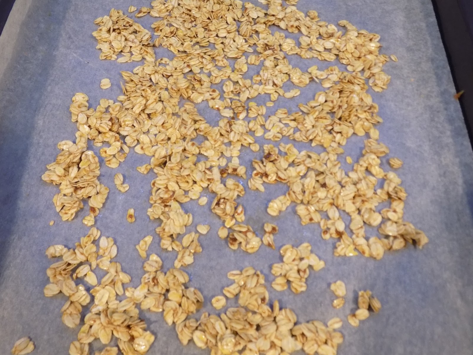 Kõigepealt tuleks alustada kaerahelvestest, sest neil on kõige mõttetum maitse ja seda tuleb tuunida. Selleks segan ma kokku 1 spl või ja 1 spl pruuni suhkru, ning sulatan ära. Siis segan kausis kokku kaerahelbed ja või-suhkru segu. Asetan nad küpsetuspaberiga kaetud pannile ja panen nad ahju küpsema. Neid tuleks aegajalt segada ja kokku olid nad mul ahjus 15 minutit.