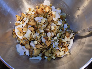 Siis liigun edasi röstimise juurde. Selleks hakin india pähklid pisut väiksemaks ja segan nad seemnesegu ja kookoselaastudega kokku. Kuumutan panni !ilma rasvaineta! ja röstin nad seal õrnalt pruunikaks, segu tuleb pidevalt jälgida, kuna pisikesed pähkli tükid võivad kõrbema minna ja see rikub kogu maitse ära. Segad ja hoiad silma peal, kuni nad on õrnalt pruunikad ja tunned nende lõhna. Siis panni pealt otse sinna kaussi, kus ma segasin kokku kaerahelbed suhkru-võiga, pole mõtet uusi kausse määrida.