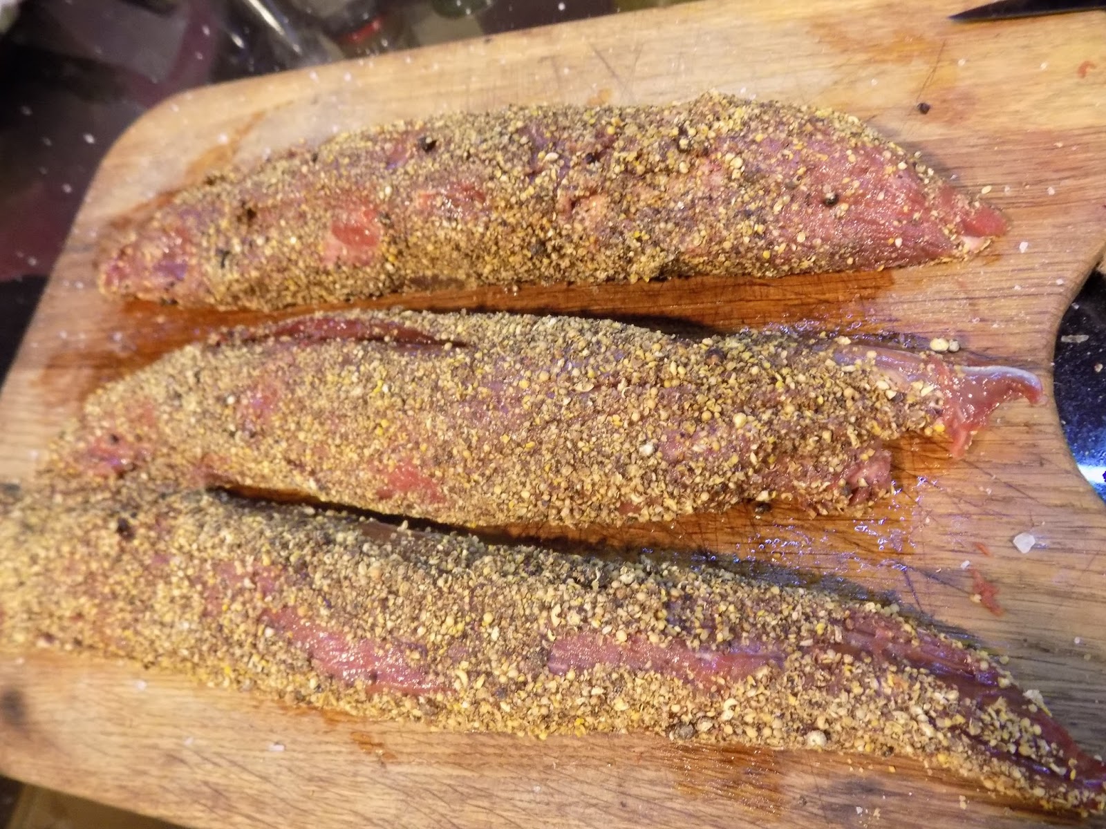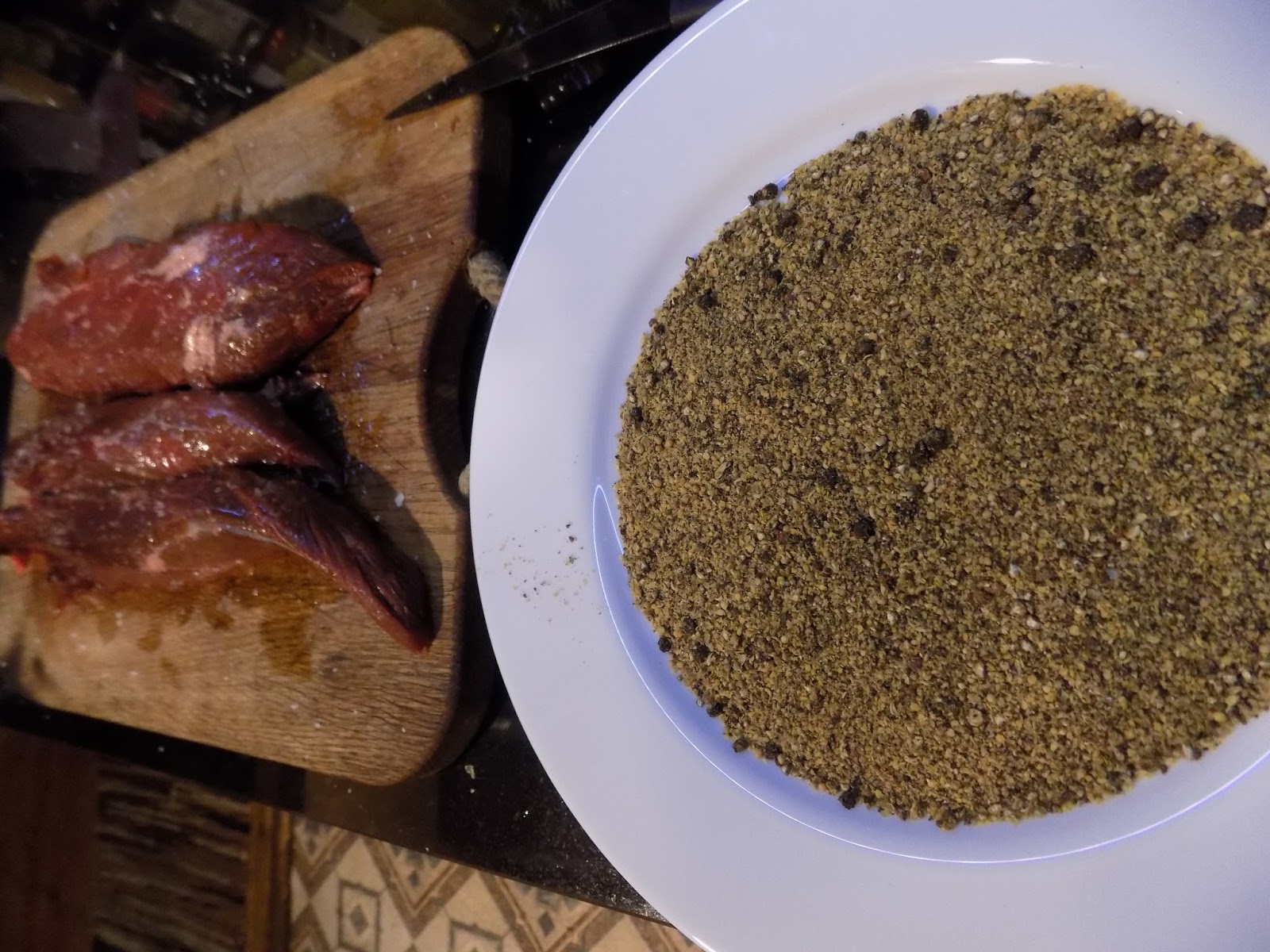 Ütlen kohe ära, kellel pole metssealiha võimalusi, ei pea meelt heitma, sest väga edukalt saab teha teda ka kodusea sisefileega või lausa veise omaga, kes mida eelistab. Piprakatet saab ka igaüks endale meelepäraseks tuunida, mina kasutasin kahte sorti pipraid ja lisaks sinepiseemneid. Koguseid mõõta pole mõtet, tuleb teha tunde järgi :).
