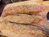 Järgmisena tegin sisefileed pisut õliseks (et piprakiht ilusti peale hakkaks) ja raputasin peale soola. Siis kastsin iga filee piprasegu seest läbi, tupsutasin teda nii et eriti suuri pipravabu kohti ei jääks.