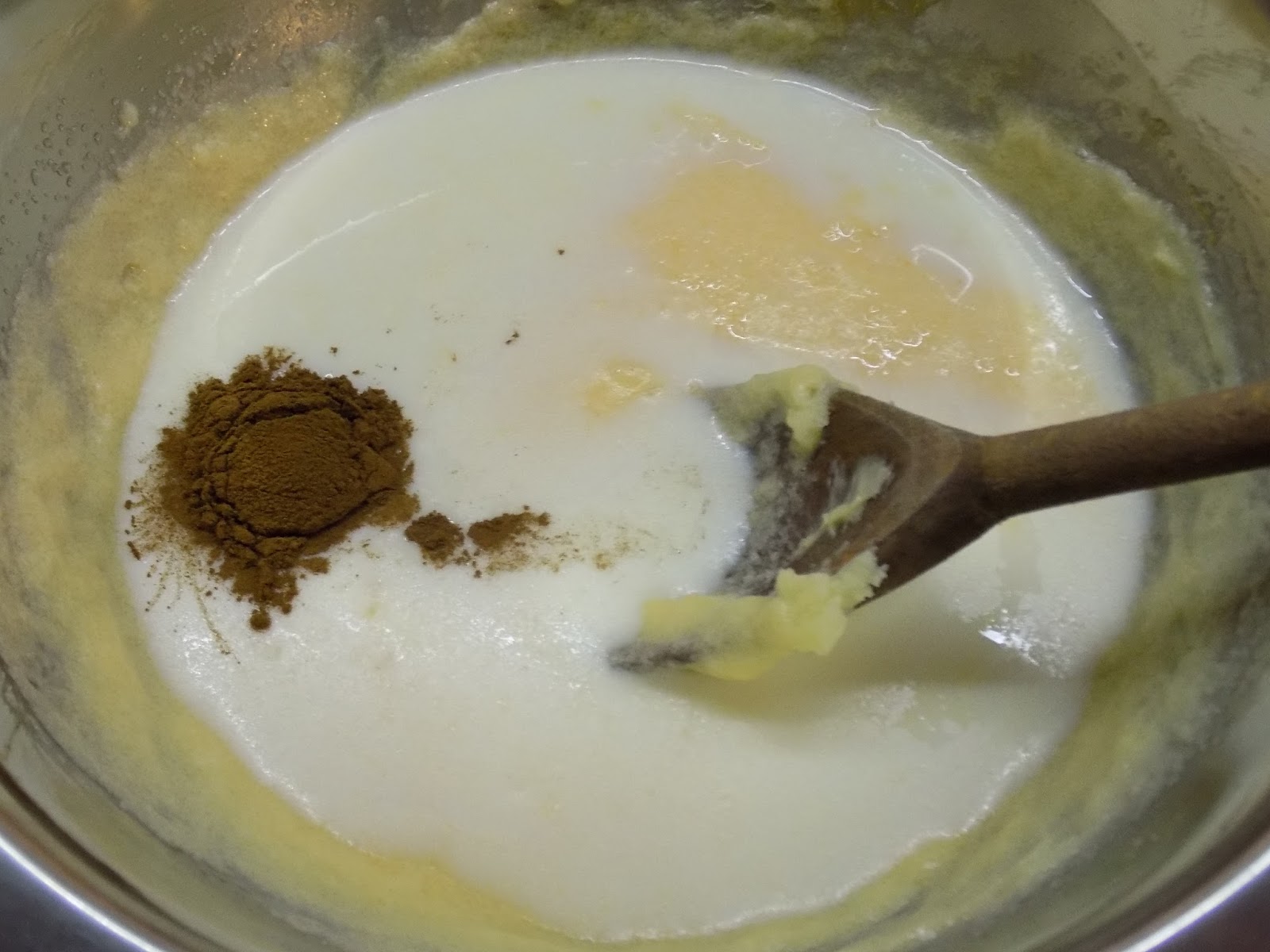 Kõigepealt tuleks veenduda, et või on toatemperatuuril (ma tavaliselt võtan päev varem välja). Siis ma hõõrun ta puulusika ja väikse suhkrukogusega vahtu, võtab aega võib olla 4-6 minutit, siis lisan ülejäänud suhkru ja segan kõik segi. Järgmisena lisan ühekaupa munad ja segan segi. Lisan ka kaneelipulbri ja piima. Olen kaneelipulbri ka pannud puru sisse ja mitte taignasse, oleneb kuidas tuju on :).