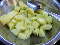 Selleks ma koorisin ja lõikusin kartulid, panin kaussi, lisasin pisut õli, soola, pipart, läbi küüslaugupressi 2 küüslauguküünt ja piparrohtu.