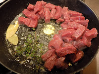 Järgmisena tükeldasin veise, loomulikult ristikiudu kuna muidu ei küpse ta kunagi pehmeks. Siis võtsin sügavkülmast ürdivõid, mis on ideaalne praegusel aastaajal. Panin pannile ürdivõi, pisut õli, loorberilehed, tüümiani oksad ja veise tükid, praadisin nad läbi, lisasin soola ja tõstsin ahjupotti köögiviljade peale, mõni lihatükk oli roosakas, aga see küpseb kõik ahjus lõpuni.