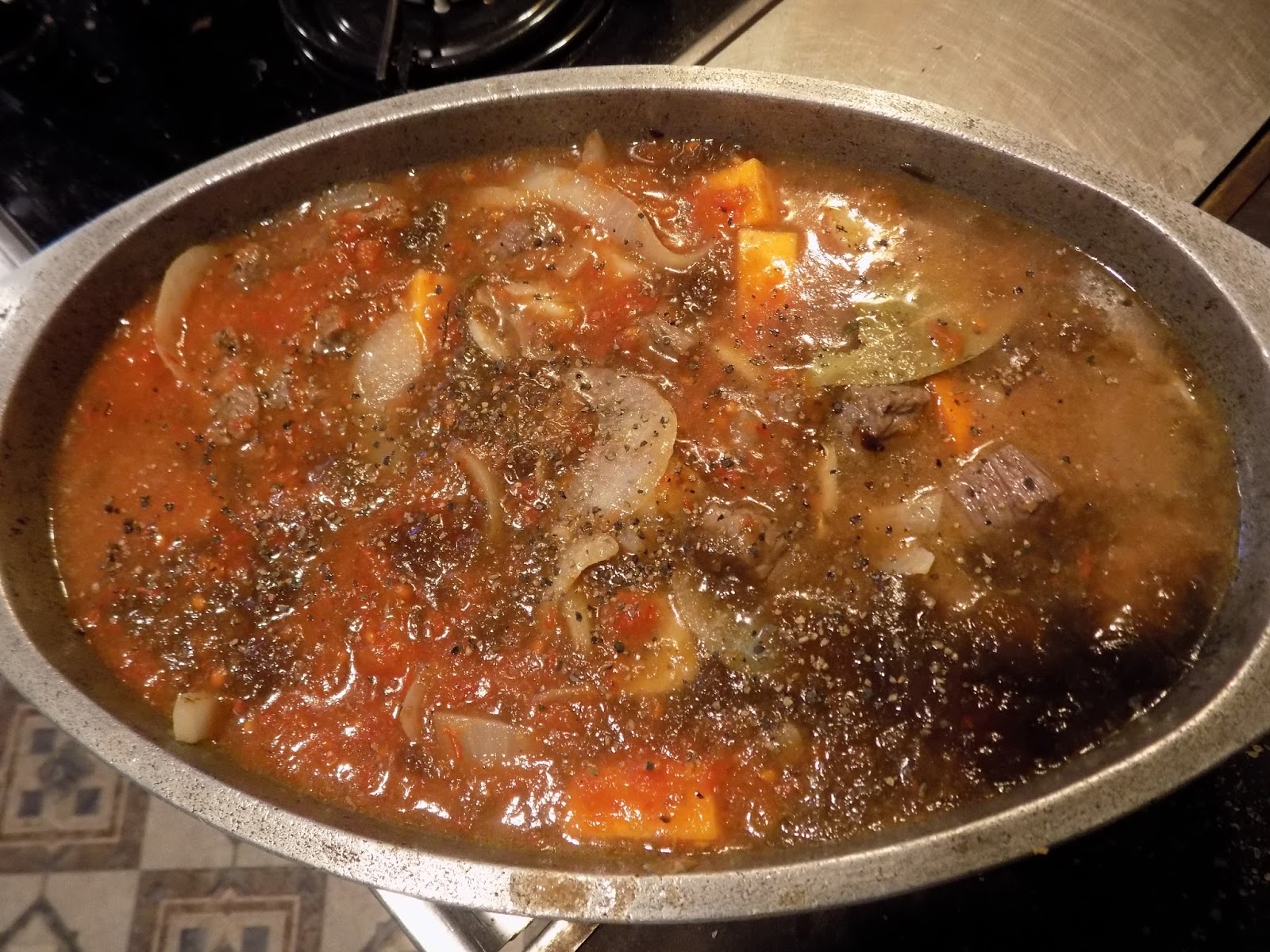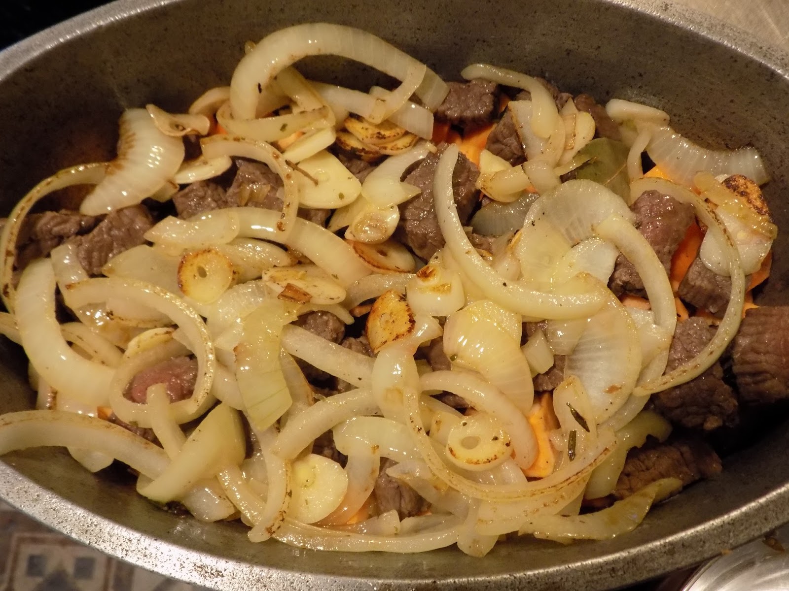 Praegu on igasugused “ühe poti” toidud kõige minevam kaup, vähemalt meie peres, kütad ahju soojaks, pott ahju ja kõik valmib justkui iseenesest, tööd on vähe ja lõpptulemus ülimaitsev. Minul oli sügavkülmas veisetükk, esikus porgandit ja bataati, nendest ja mõningatest lisanditest see imemaitsev söök tekkiski. Lisandiks võib teha ükskõik mida, ma keetsin spagette, aga kes tahab kaloreid kontrolli all hoida, võib kõrvale teha värske salati.