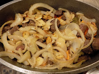 Järgmisena koorisin ja tükeldasin sibula ja küüslaugu, ning praadisin nemad ka pannile jäänud mõnusate lihamahlade sees läbi. Asetasin ka nemad ahjuvormi, pealmiseks kihiks.