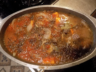 Siis tuleb liikuda vedelike juurde. Panin purgi kodust tomatipastat, mis on mõnusalt maitsestatud ning lisasin ka selle sama purgitäie vett, lisasin ka ulukipuljongit, mis on mõnusalt tume ja maitseid täis. Siis segasin kõik pisut segi ja lisasin soola ja pipra keerud.
