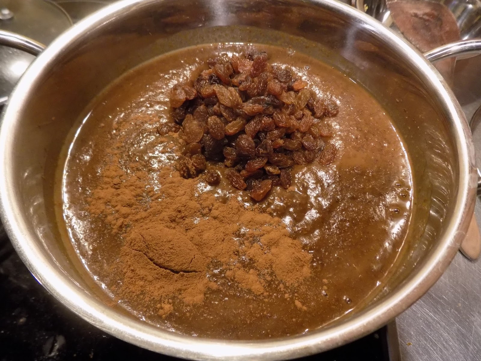 Järgmisena panen ta tulele tagasi, lisan rosinad ja kaneeli, ning lasen pisut aega veel podiseda.