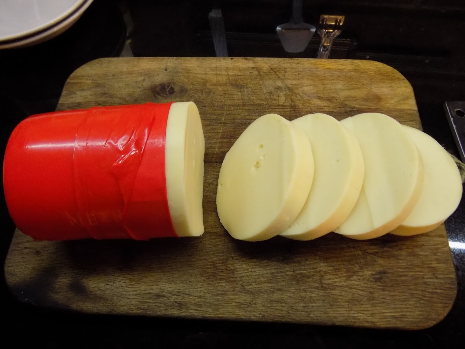 Kõigepealt siis lõigata suurest juustukänakast 4 viilu, nad päris ühe paksused ei tulnud aga ma niikuinii praen igaüht eraldi, nii et pole hullu. Mina ostan sellise suure känaka Seljal asuvast poest, kust saab lisaks juustule ka maailma parimat kohupiima.