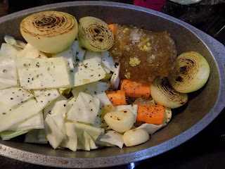 Järgmisena sättida oma ahjupotikesse kõige alla porgand ja kartul (mis vajavad rohkem küpsemisaega), järgmisena sibulad ja küüslaugud, ning kõige peale kapsas, mis saab ainult auru ja jääb mõnusa tekstuuriga.