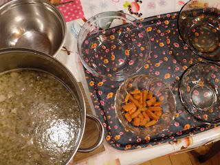 Kes tahab oma sülti kaunistada, siis peaks samal ajal kui sült keema tõuseb, välja otsima kausikesed ning põhja oma kaunistuse ära tegema, ma kasutasin siis puljongist välja kurnatud porgandit, pipra ja vürtsi teri, ma panen tahtlikult pipraterad süldi sisse tagasi, sest mulle meeldib piprane üllatus :).