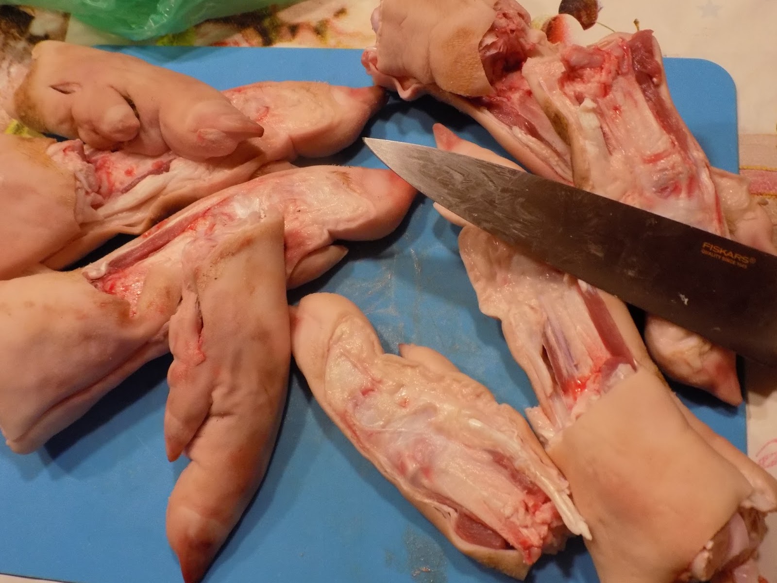 Kõigepealt siis tuleks lõigata seajalad pooleks, niikaugele lõikad noaga kuni tuleb vastu kont, siis murrad ta pooleks ja lõikad lahti. Lahtilõikamine kiirendab protsessi.