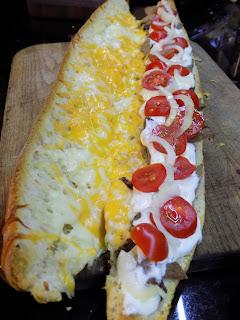 Siis saab edasi liikuda baguette juurde, ta tuleks lõigata pooleks aga nii et kaks poolt jäävad ikkagi üksteise külge ja siis pisut alla suruda, et tekiks nagu eriti veider liblikas. Siis ühele poolele panin ma paar peotäit mozzarellat ja cheddarit, teisele poolele panin lihalõigud, mis on eelnevast praest ülejäänud. Siis tuleks ta panna ahju ja lasta tal seal niikaua olla kui juust on sulanud ja sai soe ja krõbe (umbes 5-6 min).