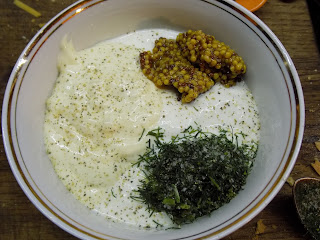 Selle aja jooksul teen ma valmis kastme, segan kokku hapukoore, majoneesi, täisterasinepi, tilli, soola ja pipra. Maitsen, kas on okei ja jätan seisma.