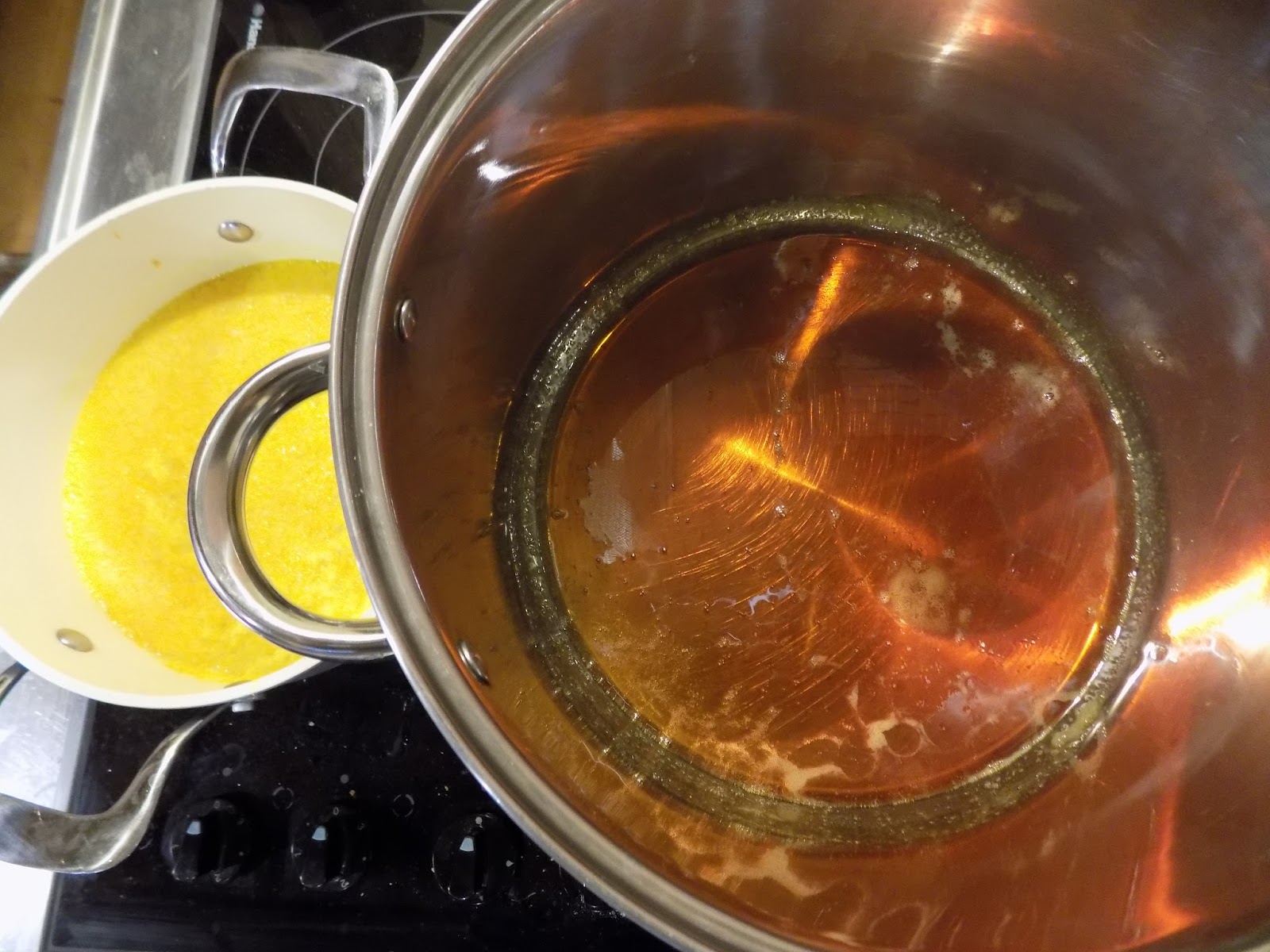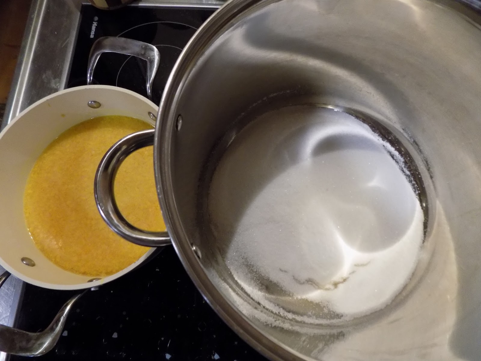 Kõigepealt tuleks tegutseda apelsinidega, kõigepealt riivi koor ja pressi välja mahl. Järgmisena tuleks poti või kastruli põhja välja kaaluda 75 g suhkrut ning see pliidile panna. Kõrvale potti pane apelsinimahl- ja koor soojenema. Nüüd on igaühe oma valik kui kaugele ta suhkru laseb (ehk kui pruuniks ta kõrvetab) mina lasen pigem vähem, kuna see kõrbend suhkru maik võib lõppkokkuvõttes taigna ära rikkuda, mulle meeldib seda mõrkjust lisada pigem vürtsidega.