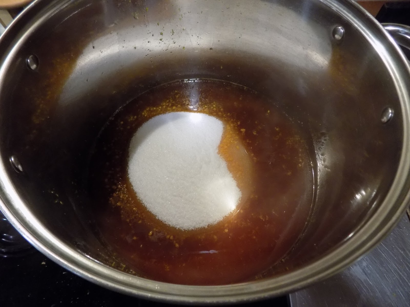 Igatahes kui suhkur on nii pruunistunud nagu soovid, lisa kuum apelsinimahl sulanud suhkrusse, aga ole ettevaatlik sest võib pritsida, kohe samal ajal kui kallad võta ka vispel ja sega, aga ära end ära kõrveta. Siis kui see on tehtud, lisa sinna segusse veel 250 g suhkrut ja kuumuta, kuni suhkur on sulanud ja siirup paksenenud.