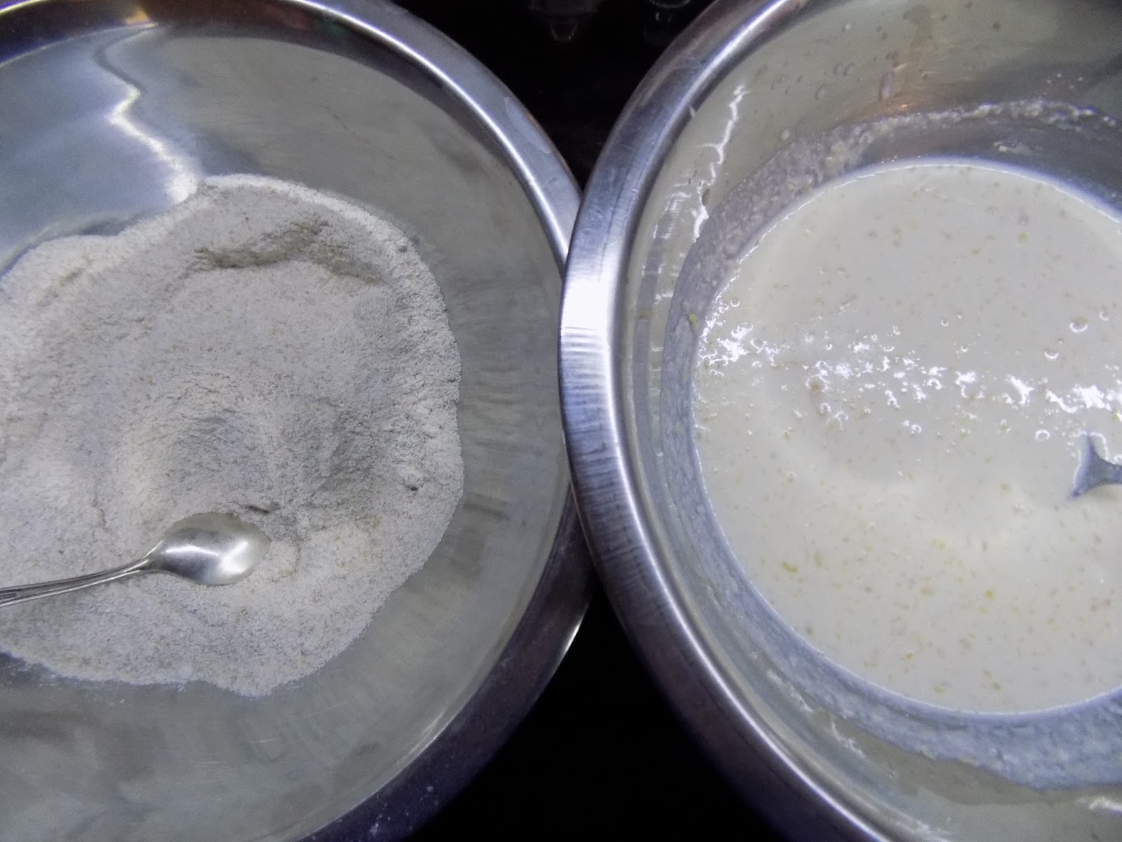 Võta teine kauss, kaalu sinna odrajahu ja nisujahu, lisa ka sooda, sega omavahel segi ja jäta ootele.