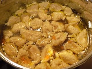 Kui puljong on valmis käib supitegemine ülikiirelt. Keda ei häiri puljongikuubiku maitse ja endal värsket puljongit pole, siis julgelt lasku see käiku. Kõigepealt siis ma koorin ja tükeldan kuubikuteks porgandi, sibula ja küüslaugu. Siis panen poti tulele ja lisan pisut õli, siis kuumutan porgandi, sibula ja küüslaugu koos läbi, väga hea lõhn tuleb juba. Siis kui porgand on pisut pehmem, lisan ma puljongi ja lasen keema tõusta, selle aja jooksul teen ma valmis klimbitaigna. Selleks klopin kahvliga kausis lahti 3 muna, lisan umbes 2 dl jahu, oleneb kõik munade suurusest ja kui ilusaid klimpe keegi tahab. Mul see ilu eriti oluline pole, vaid see et klimbid oleks pehmed, selleks lähebki vähem jahu. Kui klimbitaigen on valmis, panen ta kõrvale ja uurin potis toimuvat. Maitsen, porgand, sibul ja küüslauk on andnud mõnusa nüansi juba täiuslikule puljongile. Siis kui ma olen rahul, lisan sisse klimbid, ükshaaval teelusika suurused. Viimasena lisan kukelihatükikesed kontide ümbert, mis mul puljongikeetmisest üle jäid.