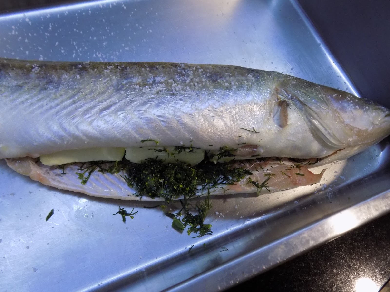 Kõigepealt siis kala puhastada, kui see on tehtud siis kõhuõõnde panna till, pisut sidrunit, pool võikogusest ja soola nii kala sisse kui mõlemale poole peale. Siis ahi kuumenema 180 kraadi juurde. Kui ahi on temperatuuri saavutanud, siis kala ahju, kokku kulus mul umbes 40 minutit, oleneb kala suurusest, keskmine aeg on seal 35-45 minuti vahel.