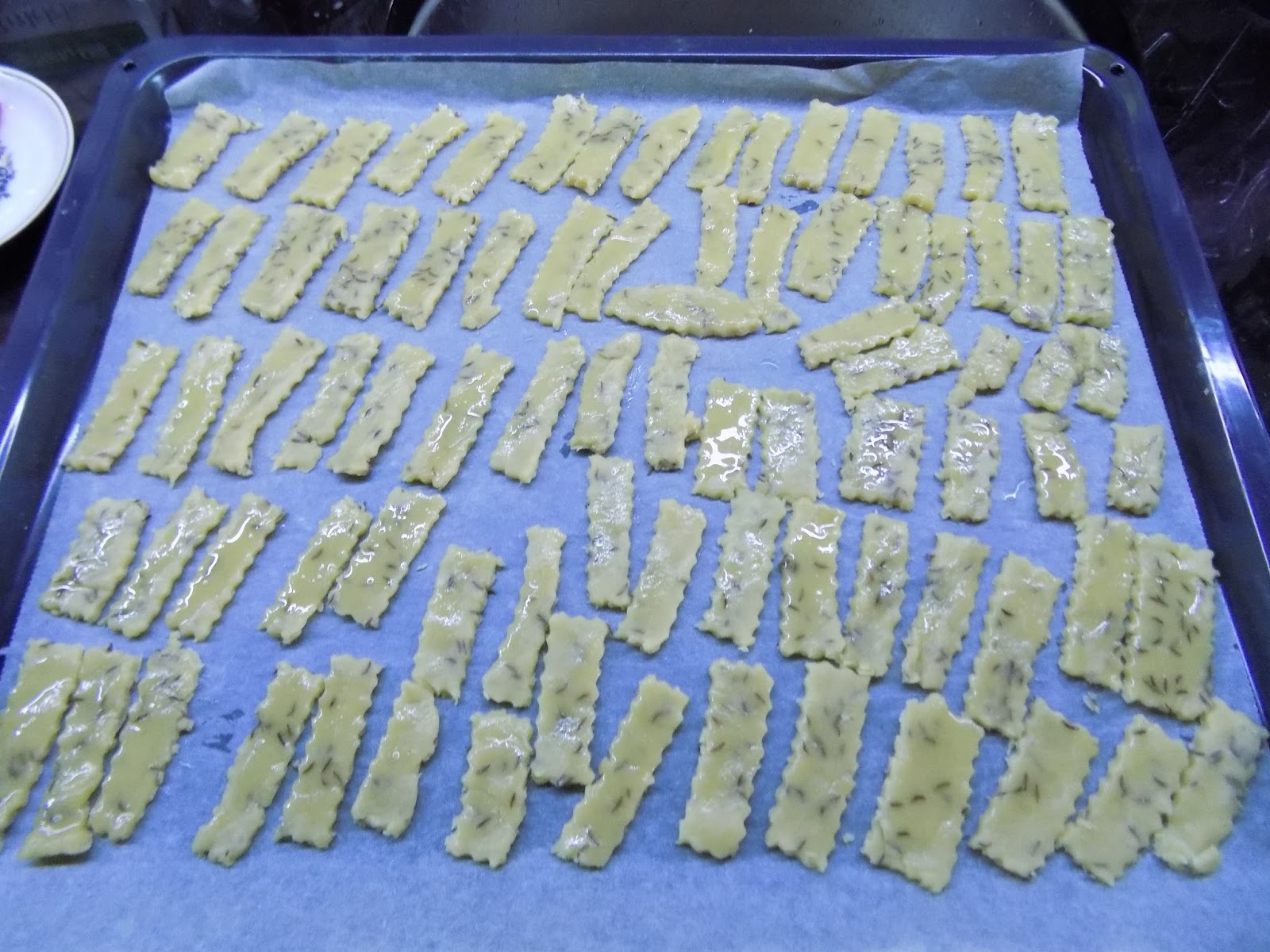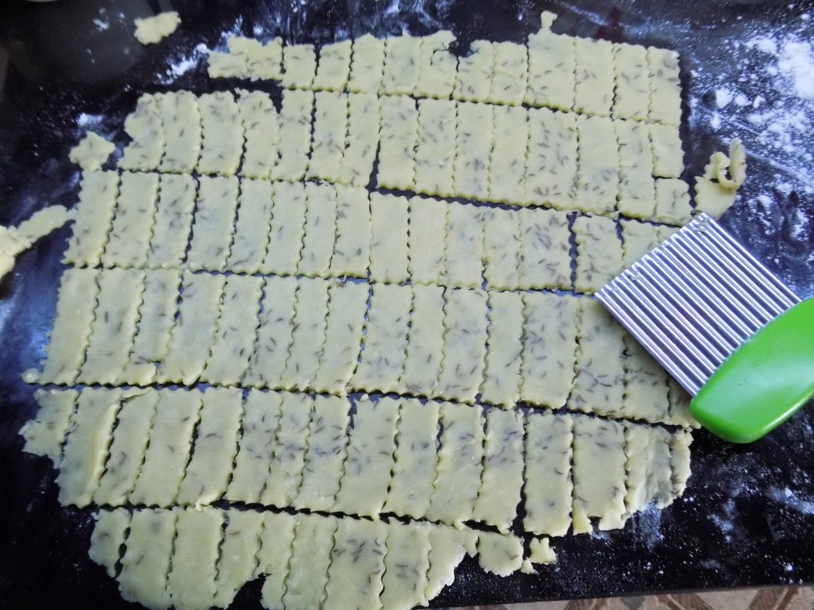Kui tund on möödas, siis ahi 210 kraadi juurde sooja ja tuleks tööpind pisut jahuga kokku määrida ning hakata rullima (mul millegi pärast on köömnetaigen alati pehmem ja juustutaigen kõvem). Rullida tuleb rahulikult, kuna tainas on väga mure. Paksus ja pikkus on igaühe enda otsustada, mina tegin siis sellised, kasutasin lainelist lõikajat, et jääks ilusad ääred. Kuna mul jällegi ei ole tainas rullitud nelinurkseks, siis need ääretükid, mis ei anna soolapulga mõõtu välja, teen omavahel uuesti palliks ja rullin uuesti. Siis küpsetuspaberiga kaetud ahjuplaadile sättida nad ilusti ritta, määrida ka igaüht pisut õlise pintsliga.