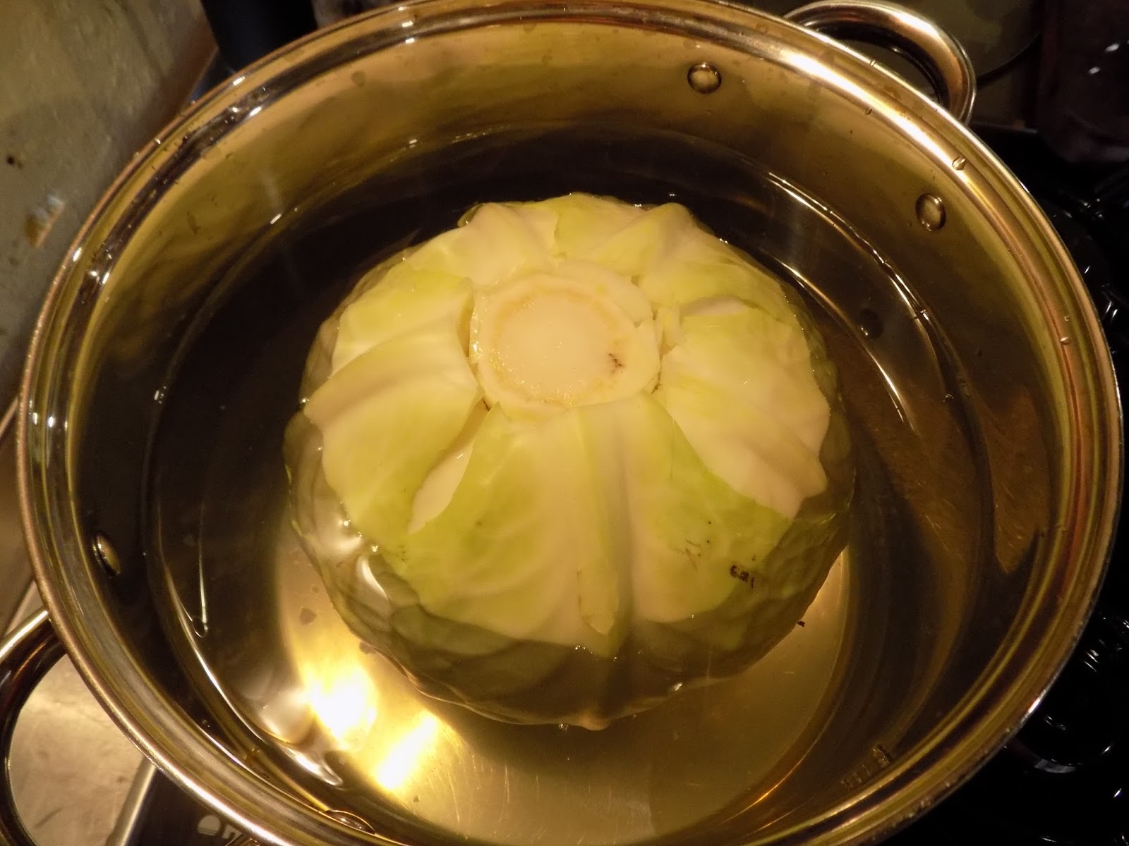 Siis tuleb tegeleda kapsaga, lõigata juurika ümber nii sügavale kapsasse kui saad, hea oleks kui saaksid juurika kätte (mida mina ei saanud, kuna see oli liiiiga kõva). Siis panna ta soolaga maitsestatud vette keema, mul läks ikka päris kaua aega, kui esimene leht tahtis lahti tulla, eks see oleneb kapsa suurusest ja vanusest. Teda võib ka keerutada seal potis, et ülemine osa ja alumine osad mõlemad saaks kuuma.