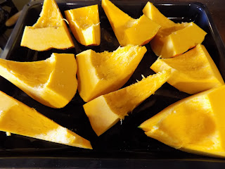 Kõigepealt ahi kuuma 180-190 kraadini. Kui on oma kodu-kõrvits, siis lihtsalt ta ära pesta, tükkideks, sisu-seemned välja ja ahjupannile küpsema. Kui on kuskilt kahtlasest kohast (loe: mitte eestimaalt), siis ma ei soovita neid koori süüa, aga eks igaüks ise otsustab seda :). Ja kindlasti kuivatada ära kõrvitsaseemned, mõnus hiljem näkitseda.