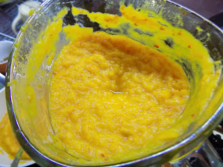 Kui nad on pisut jahtunud, tõstsin ma nad kannmikserisse ja lasin püreeks. Peale jätsin koore mis lisab kollasele kõrvitsale lõbusaid oraanžikaid tükikesi. Mul on kõrvitsasordiga vedanud, ei pidanud lisama vett, mõni sort on kuivem, siis tuleks tilgake vett ka lisada, muidu mikser lihtsalt ei hakka tööle.
