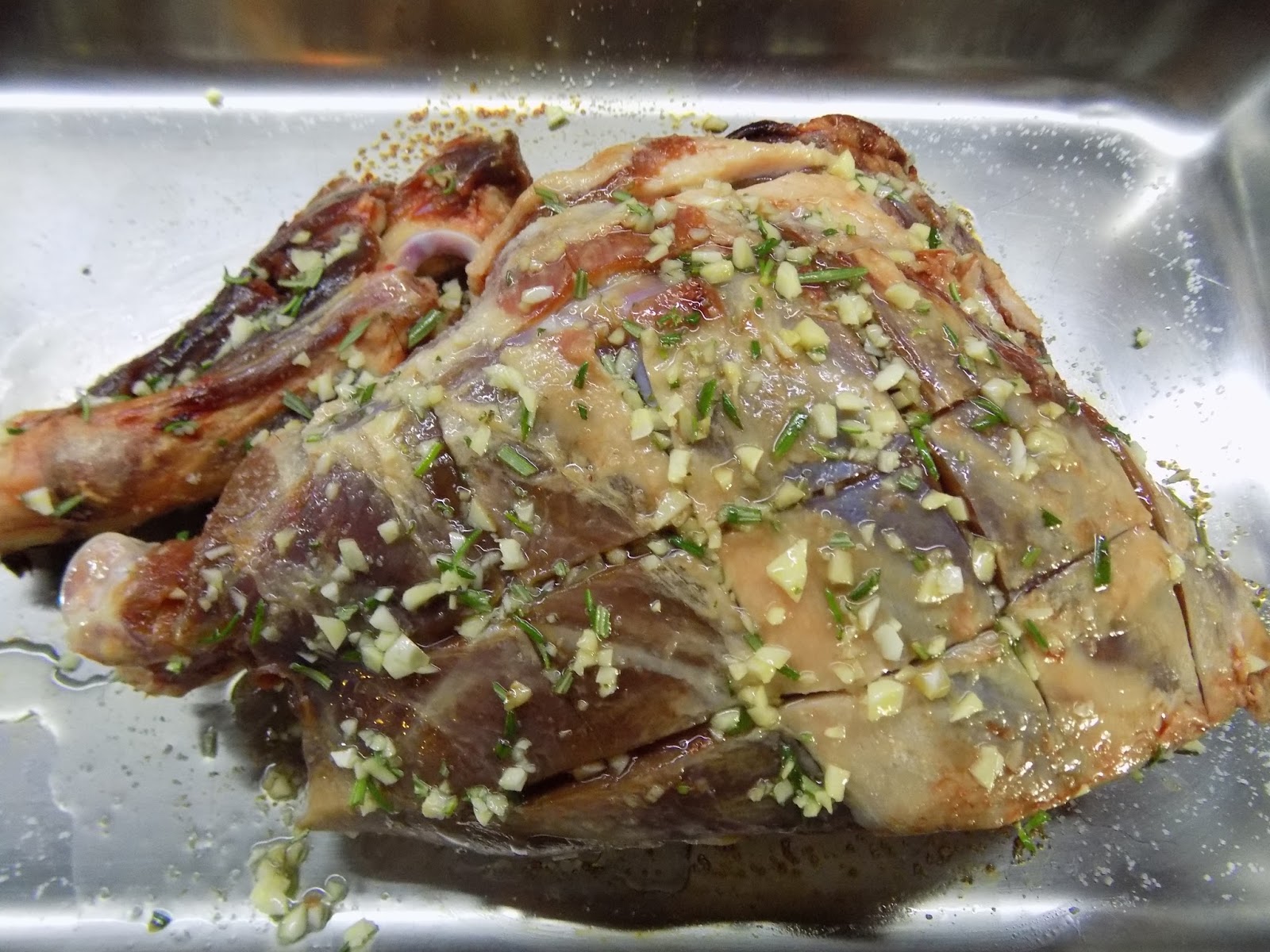 Kõigepealt tuleb marineerima panna liha, võib ka päev ette teha, mida rohkem tal aega maitsestuda on, seda parem on lõpptulemus. Lõikasin lihale sälgud, et saaks hakitud küüslaugu ja rosmariini lihale pragudesse suruda. Panin ka heldelt soola ja pipart. Vahepeal ahi 160-170 kraadi juurde kuuma. Siis proovisin teda nii palju praadida kui võimalik (väga hästi ei õnnestunud, kuna tükk on ebasümmeetriline ja suur, pisut värvi sai ikka peale).