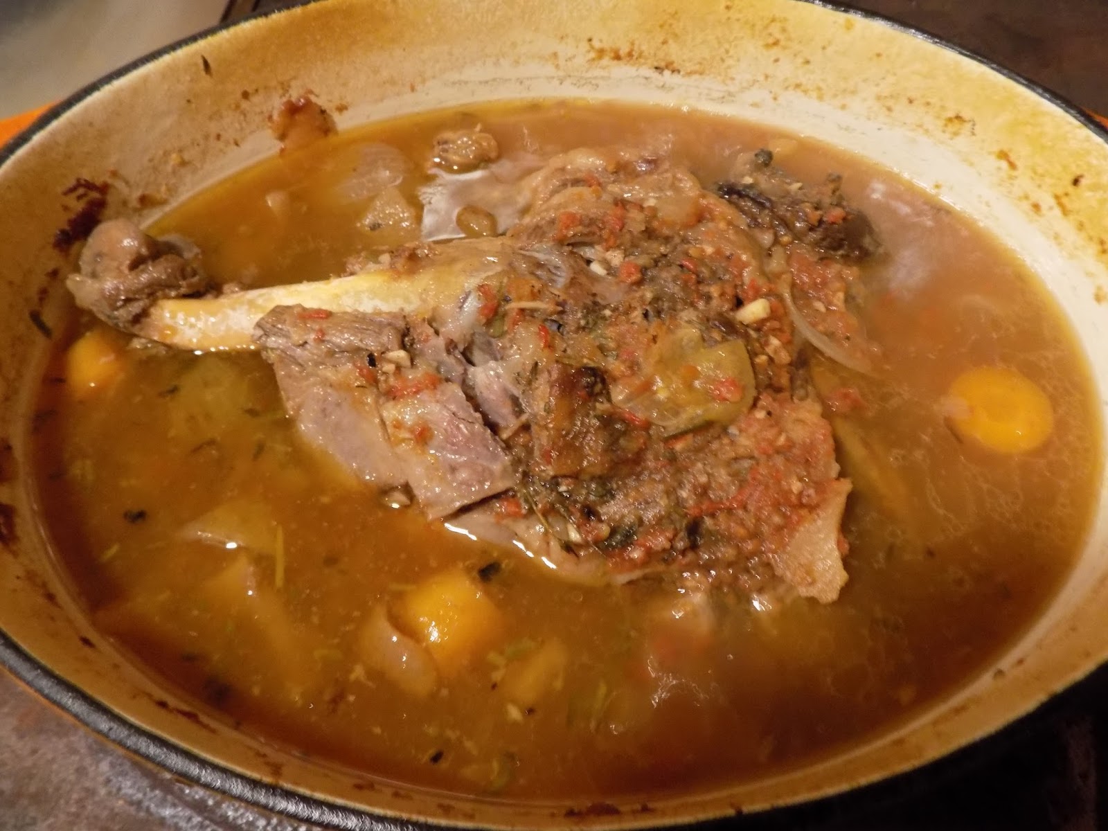 Kuid lihatükk on suur ja pole üleni vedelikuga kaetud, panen ka oma kodust tomatipastat ühe purgi täie ja selle loputusvee ka. Ikka on pisut vähe, siis ma loputasin ära selle anuma, kus ma seda liha marineerisin, pisut küüslauku ja soola on seal peal, seega loputan selle veega ja lisan ahjupotti, nüüd on vedelikku piisavalt ja liha on üleni kaetud. Jesssss. Viimasena panin peale peotäie tüümiani, mille ma paari tunni möödudes ära võtsin, kuna need puitunud varred on hiljem väga ebamugavad toidus.
