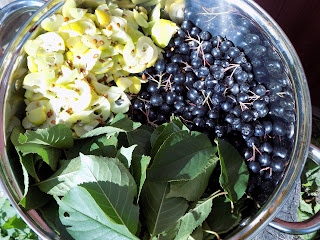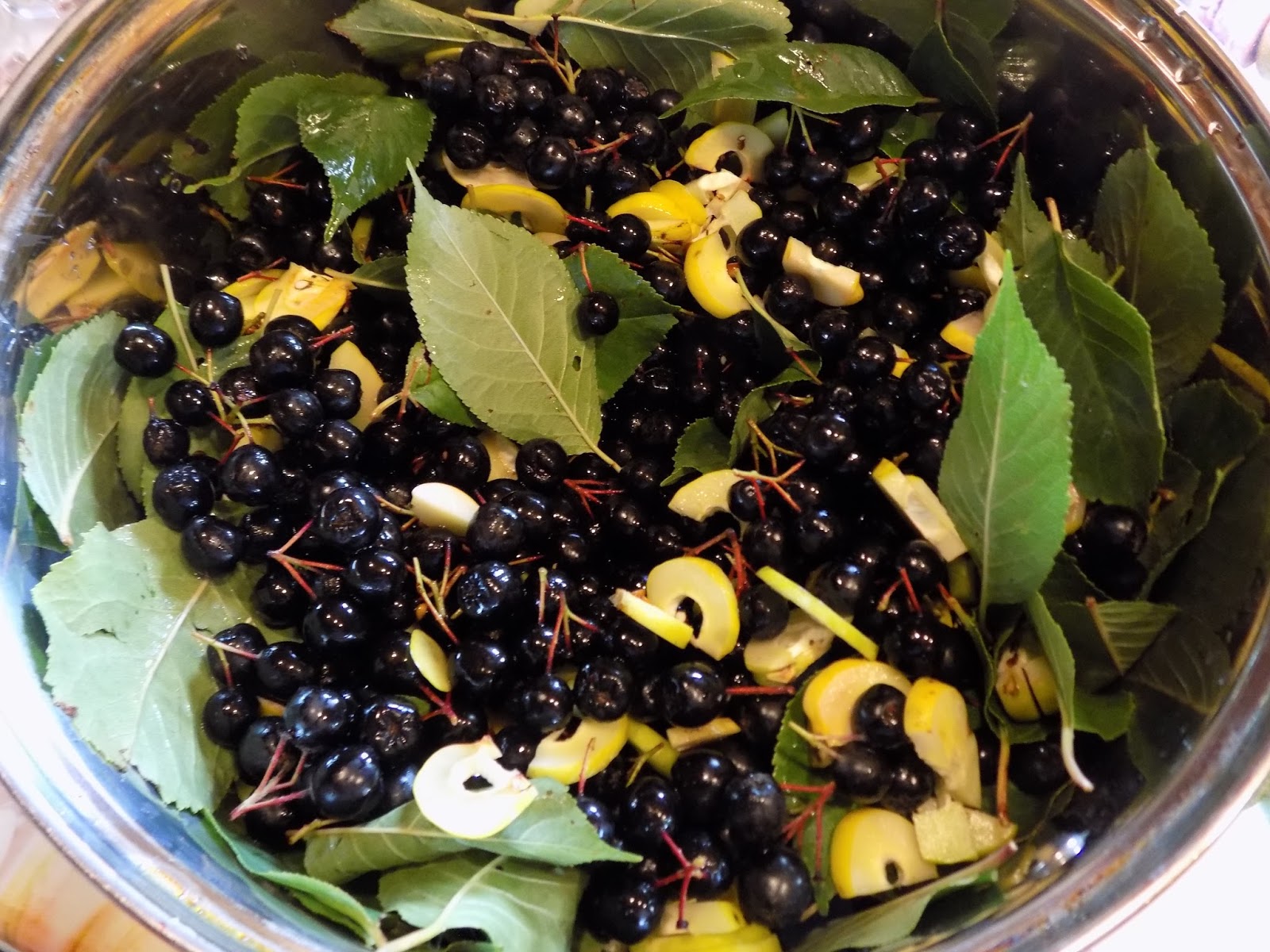 Aroonia-ebaküdoonia-kirsilehe mahl. Aroonia põõsas oli see aasta marja-kobaratest lookas, ebaküdooniaid (meie põhjamaa-sidrun) nii palju polnud kui mõni aasta aga sain ikka paraja koguse ning kirsilehed, mis niikuinii sügise saabudes maha langevad. Kõik panna potti ja ongi olemas mahl, mis on pungil vitamiinidest. Talvel mulle näiteks ei meeldi juua heledaid mahlu (õunamahl), aga isegi lausa isutab selliste tumedate järgi, sest talvel on vaja toidust ja joogist saada topelt-toetust, et püsida terve ja rõõmus :).