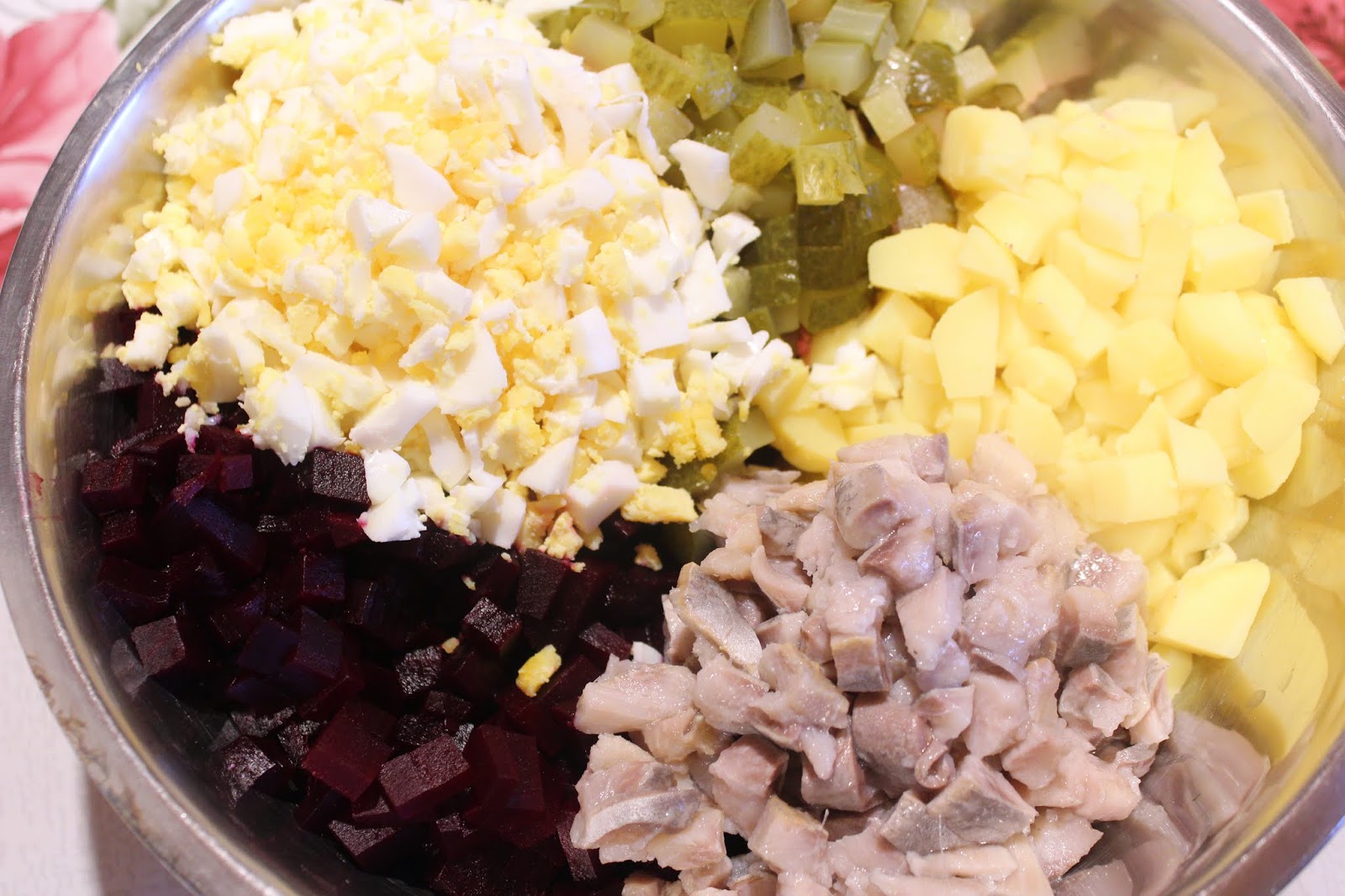 Lõikuda kartul, peet, marineeritud kurk, heeringas ja muna. Siis lisada juurde hapukoor ja majonees. Vastavalt enda meelepärasele konsistentsile. Lõpuks paneme me ka sortsu hapukurki vedelikku.