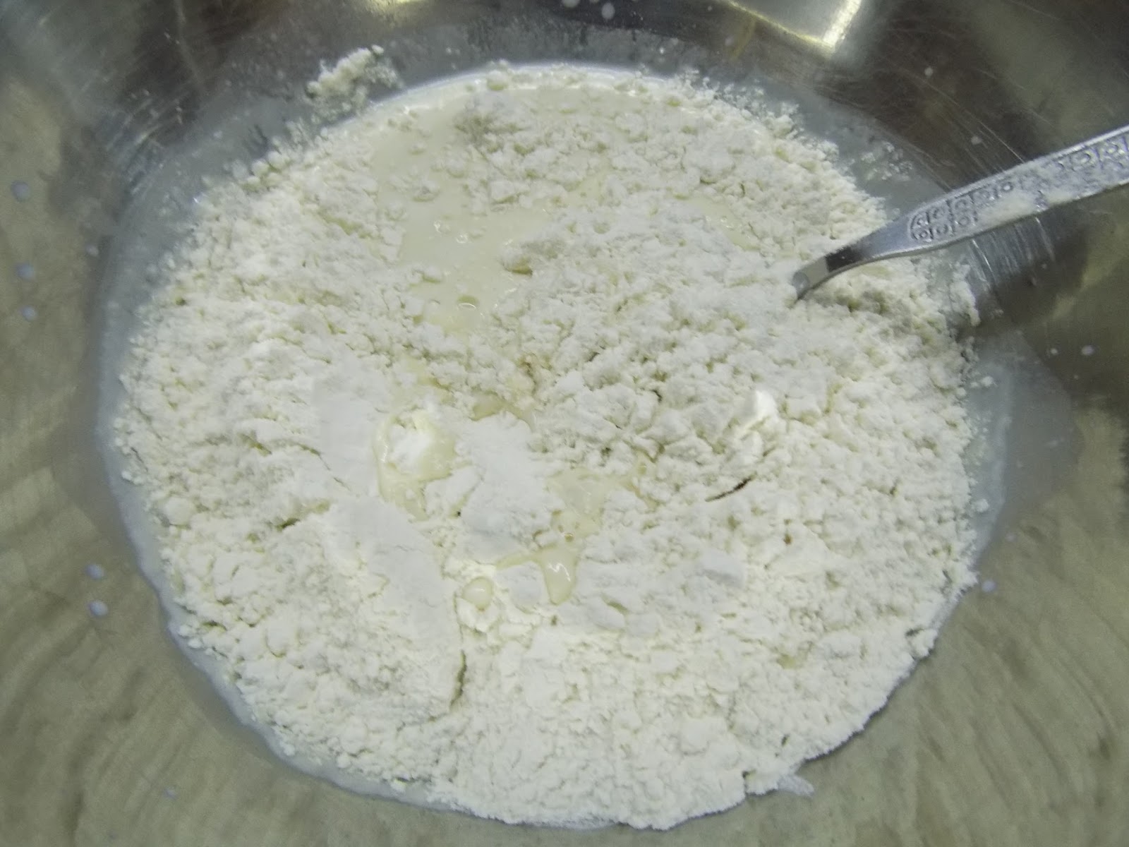 Kõigepealt kaalu välja ja pane soojenema piim (käesoojaks). Samal ajal võid kaussi juba valmis panna pärmitüki, soola ja suhkru. Siis lisa soe piim ja sega, kuni on ühtlane. Lisa ka pool jahust (200g), sega korralikult läbi ja jäta ta pooleks tunniks kerkima.