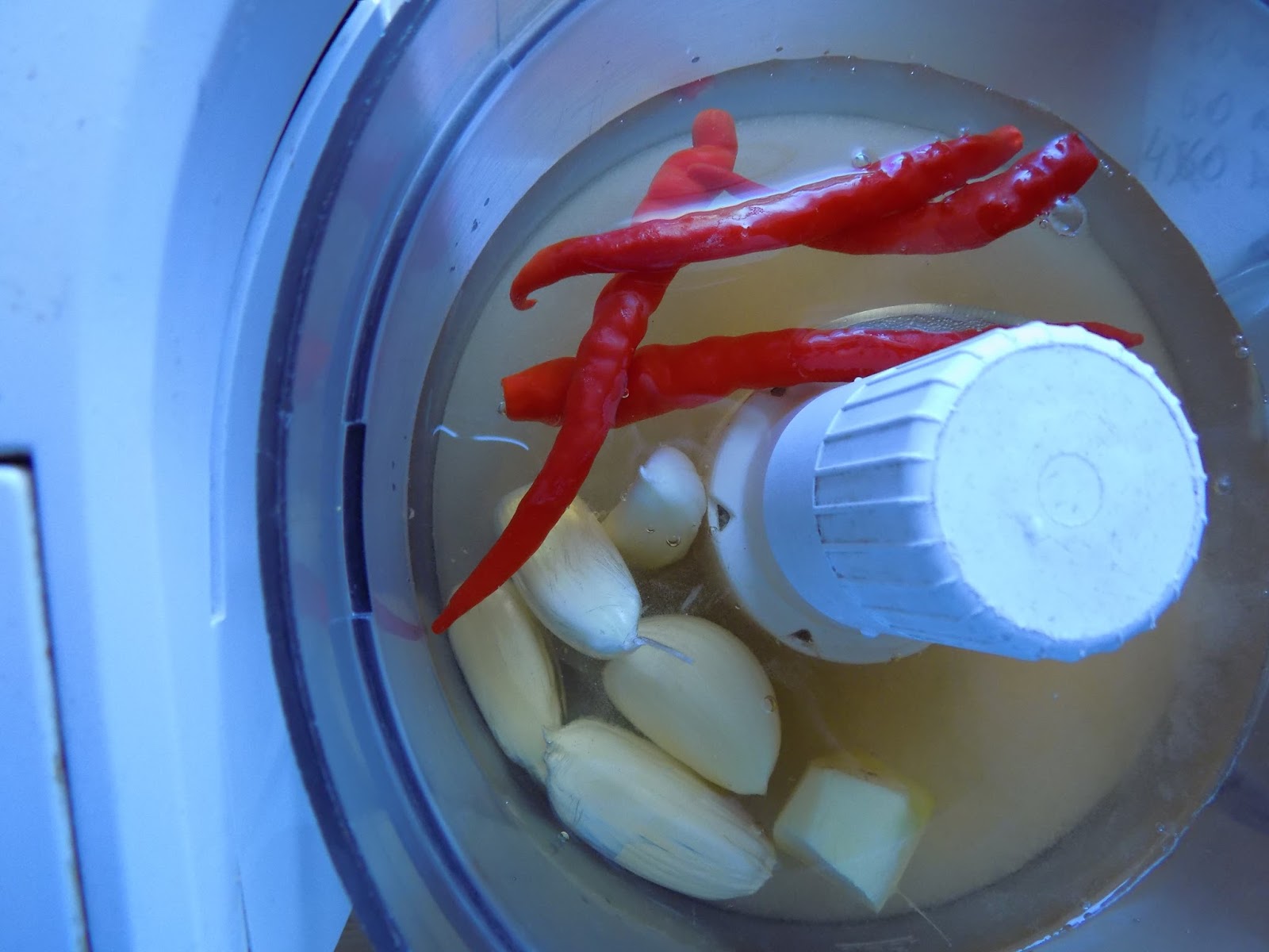 Kõigepealt siis koorida küüslauk ja ingver. Siis otsustada kas hakkida tšilli, ingver ja küüslauk või kõik vurinal köögikombainis kokku lasta. Mina otsustasin vuristada. Lisasin kõik koostisosad: tšillid, küüslaugud, ingveri, suhkru, vee, õunaäädika, soola ja lasin kõigil seguneda.