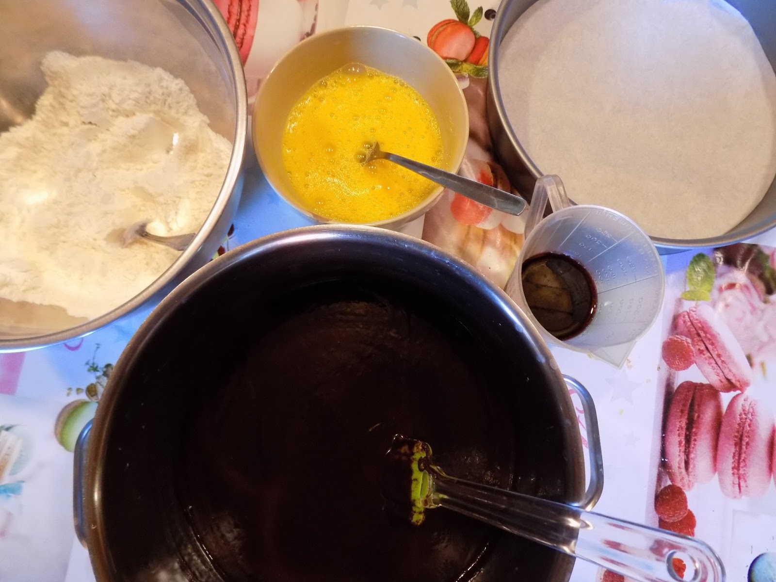 Sellel ajal kui segu vaiksel kuumusel sulab, võid ette valmistada koogivormi, vooderdades põhja. Siis kui segu on valmis, lase tal 30 minutit jahtuda ja valmista ette teised komponendid. Sõelu kaussi jahu ja küpsetuspulber, sega läbi. Klopi lahti eraldi kausis 4 muna. Ning kaalu välja vein. Kui kõik need asjad on tehtud, siis pane lõpuks ka ahi kuuma 170 kraadi.