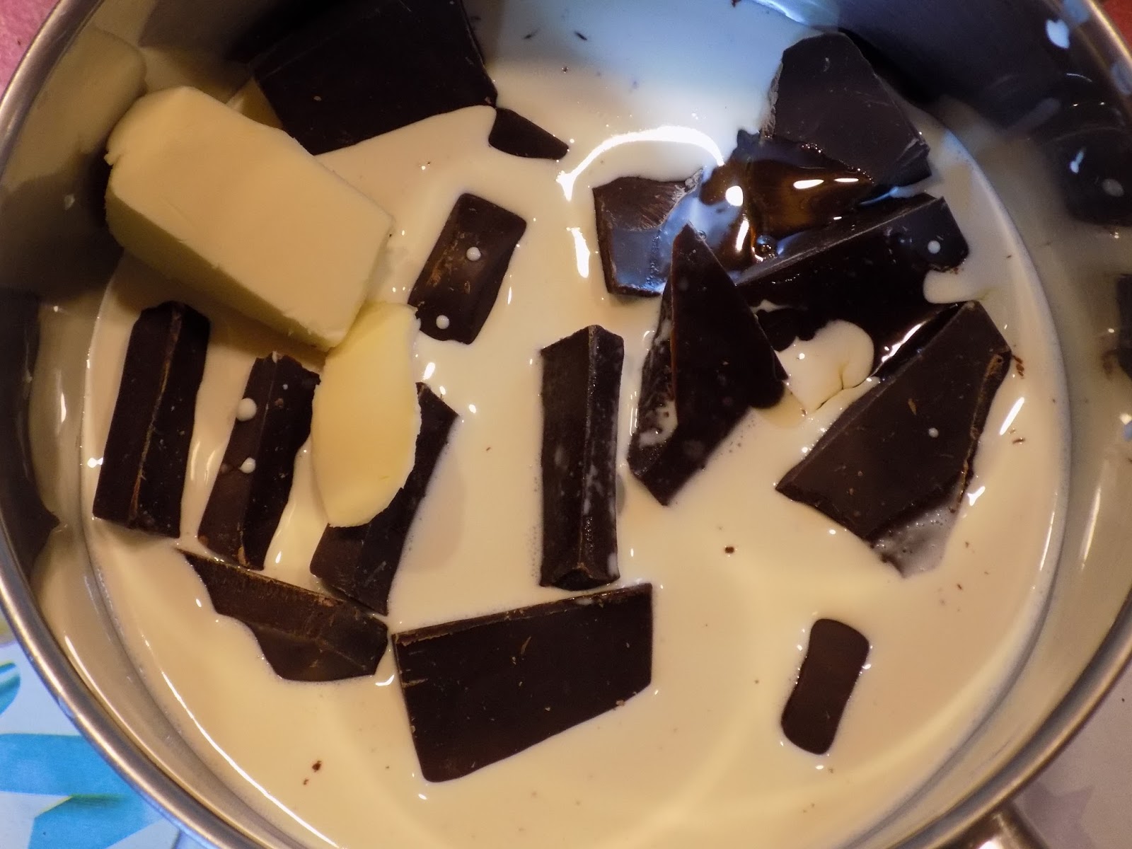 Kõigepealt siis kokku kaaluda kuskile potti või suuremasse kastrulisse tume šokolaad, või, vesi ja suhkur. Kasuta väga tasast kuumust, see tagab läikiva segu, liiga kõva kuumaga ei tule midagi välja. Lase sulada vaikselt ja rahulikult.