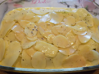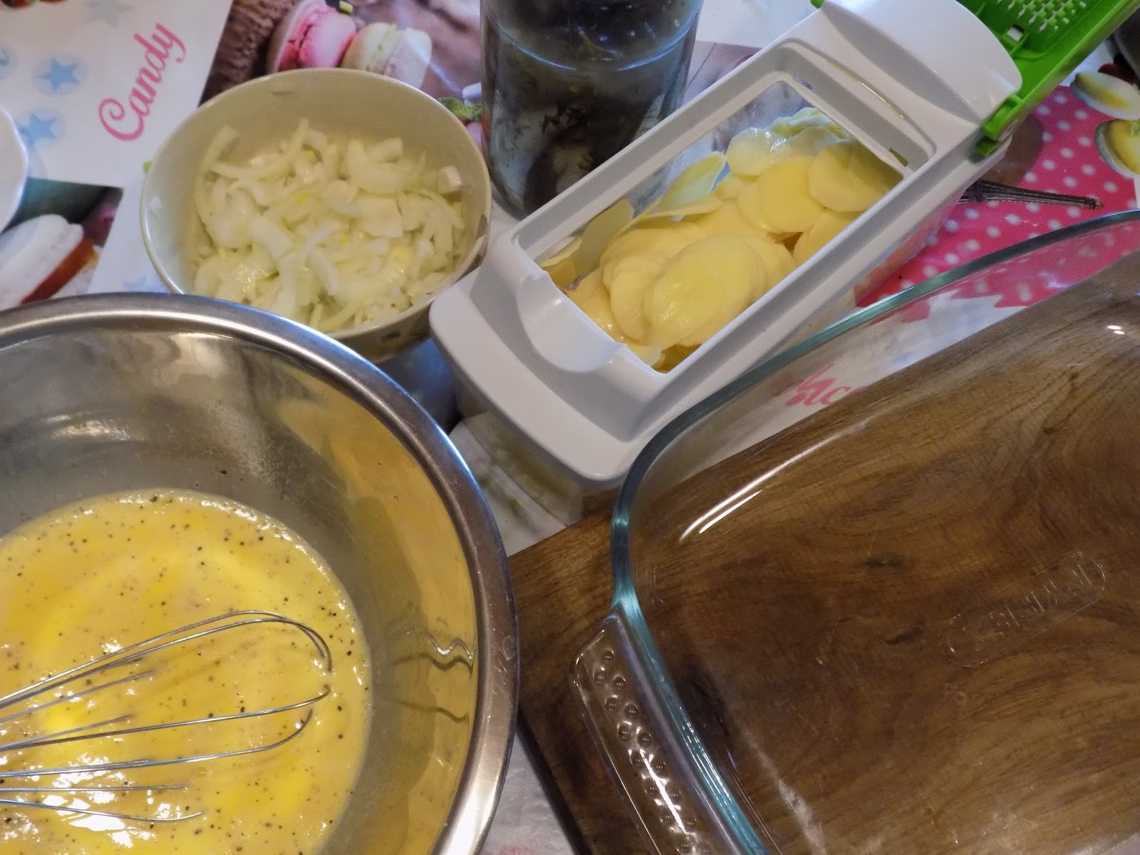 Kõigepealt siis tuleks kergelt marineerida sibul, kuna kui paneks lihtsalt toore sibula vormi, ei oleks see maitse nii hea, vaid igavam. Seega lõigata kas rattad või poolkuud, kaussi, peale äädikas ja käega läbi muljuda, jätta seisma. Siis koorida kartulid. Kui on olemas mandolin, siis kindlasti seda kasutada, või kui oled osav noaga siis lase käia, eesmärk on saada võimalikult õhukesed viilud. Siis kloppida lahti muna, lisada koor, piim, sinep ja sool;pipar. Kui need asjad on tehtud, võib panna ahju 200 kraadi juurde soojenema.