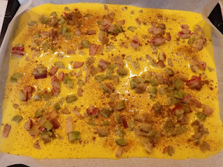 Kõigepealt siis ahi 180 kraadi juurde kuumenema. Mina siis vahustasin valged ennem, kuigi need ei läinud vahtu, vaid jäid selliseks vedelaks, lisasin suhkru 1 spl kaupa ja lõpuks lisasin ka neli munakollast. Ühesõnaga võib need 4 muna ilma rebu ja valget eraldamata ära vahustada, suhkur lisada lõpusirgel. Siis jahu ja küpsetuspulber, peotäis mandlilaaste ja ongi tainas valmis. Valasin selle küpsetuspaberiga kaetud ahjuplaadile (38x46cm), õhuke kiht jäi, kellel pisem pann tuleks küpsetusaega pisut pikendada. Siis laotasin külmunud rabarberid peale, raputasin peale suhkru ja kaneeli. Küpsetasin vaid 10 minutit ja oligi valmis. Kohe meelitas värske koogilõhn sööjad ligi, ei olnudki nad väga õnnetud, et pavlovaid seekord ei saanud :).