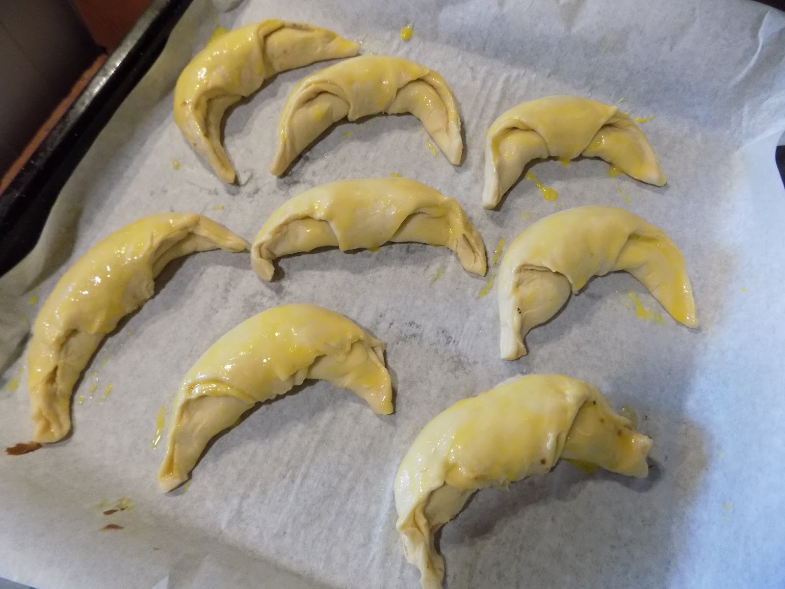 Siis tõsta kaks taignapoolt kokku, et sisse jääb sisu, siis pisut pikemaks teda venitada ja ääred kõik kokku suruda. See kolmnurk mis jäi nüüd sarvekese peale, tuleks suruda allapoole, muidu küpsedes kerkib lahti ja tuleb hoopis lahtine pirukas sealt ahjust, mitte saiake. Kui kõik on volditud, siis lahti klopitud munaga üle määrida ja ahju. Seal küpsetada 20 minutit ja valmis ta ongi. Väga korralik magusalaks.
