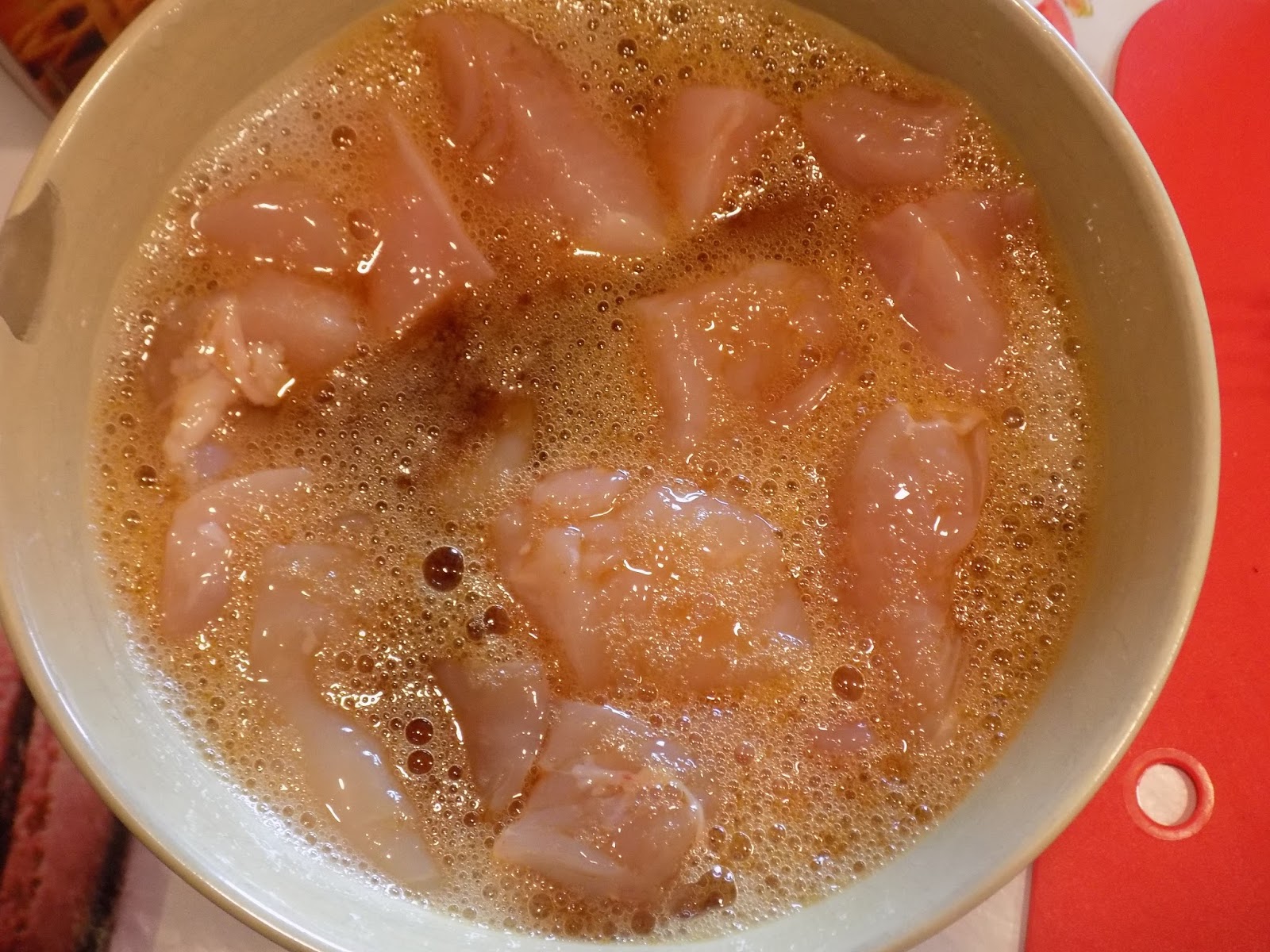 Kõigepealt on vaja kokku segada marinaad, õrnalt munavalge lahti kloppida ja muud asjad juurde lisada. Lõigata kana parajateks kuubikuteks ja panna kaussi marineeruma (umbes 10 min).