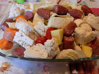 Siia võib panna täpselt selliseid köögivilju mis kodus leidub, minul leidusid need, mida näed pildil. Kartuleid ja porgandeid koorida pole vaja, piisab pesust (kui on, siis mõned mustad silmad välja torgata kartulist.) Kes liha ei taha, pole vaja lisada, on ka ilma selleta hea. Ainuke asi mida ma ei soovita on teha seda poe grillvorstidega, millel pole tekstuuri, lihtsalt roosa pudrune sisu. Saab asendada singi või mõne muu meelepärase lihatootega.