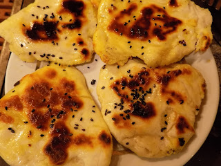 Tee jahu sisse kraater ja vala jogurti-pärmisegu sinna sisse. Sega. Lisa vesi, tekib selline mõnus, mitte kuiv tainas. Sõtku umbes 5 minutit jahusel laual, kuni on pehmem ja vähem kleepuvam. Siis võta suur kauss, õlita pisut ja pane tainas sinna sisse, kata riidega ja pane kuskile soojemasse kohta kerkima. Peaks umbes kahekordseks kerkima. Kui tunnike või rohkem on möödas, siis sõtku tainast välja õhk ja jaota kaheksaks palliks. Kuumuta pann kõrgel kuumusel (ilma õlita!) ja suru pallikesed lamedaks, äärtest paksem, keskelt õhem. Pane kastruliga pisut võid ka sulama. Pane kuumale pannile ja lase pisut pruunikas-mustaks küpseda, siis teine külg samamoodi. Pannilt ära, sulavõiga pealt üle ja raputad musti seesamiseemneid peale.