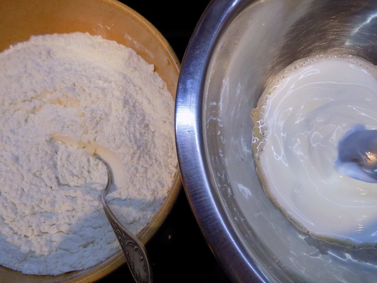 Pane pärm, suhkur ja 2 spl sooja vett kaussi, sega. Kaalu teise kaussi jahu, sool ja sega. Lisa jogurt pärmisegule.
