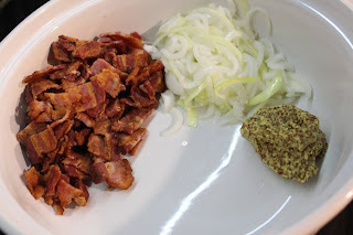 Valmistan veel ette kuumakindla nõu, kuhu lõigun soolalihast suupärased tükid, asetan marineeritud sibula ja dijoni teralise sinepi. Siis kui kartul saab keenuks, saan kohe lõigata kuuma kartuli pooleks (jah, siin on vaja korraks sepakäsi) ja tõsta ta vormi.