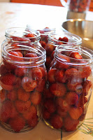 Siis tuleks maasikad mullast puhtaks loputada ja jätta sõelale nõrguma. Siis napsata sabad ja panna kohe purki. 1 liitrised purgid on meie perele täpselt paraja suurusega, nii et kasutame neid. Purki ei tasu väga tuugalt täis panna, kuna hiljem marju koos siirupiga kuumutades võivad maasikad välja vupsata.